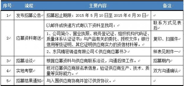 通過本次招募尋求1-2家滿足條件的覆膜砂模具供應商,作為東風精鑄制造業(yè)務鏈的有效組成部分。