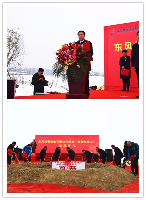 1月29日上午9時,東風精密鑄造有限公司新址一期暨智能工廠項目舉行開工奠基儀式。合肥巢湖經濟開發區黨工委副書記程習龍先生、安徽省鑄造協會會長解明國先生、安徽省鑄造協會秘書長張林先生、東風汽車零部件(集團)有限公司副總經理韓力先生、奇瑞新能源汽車技術有限公司合肥分公司總經理馬向陽先生以及東風精密鑄造有限公司總經理杜孔明、黨委書記孫長虹,東風精鑄供應商代表、東風精鑄技術人員代表參加了本次奠基儀式。